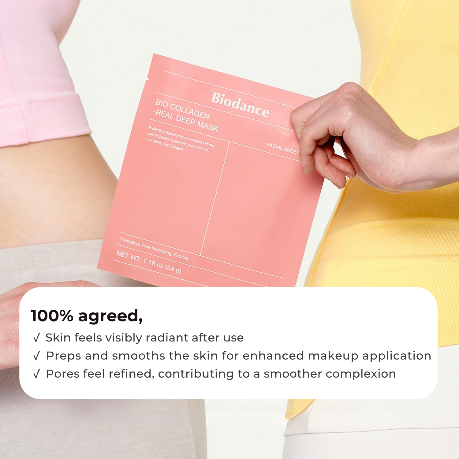 The oligo-hyaluronic acid found in the Biodance Bio-Collagen Real Deep Mask has a moisturizing effect that is superior to that of regular hyaluronic acid. It quickly hydrates the skin's surface and penetrates deeper layers of skin resulting in a healthy and moisturized complexion.
