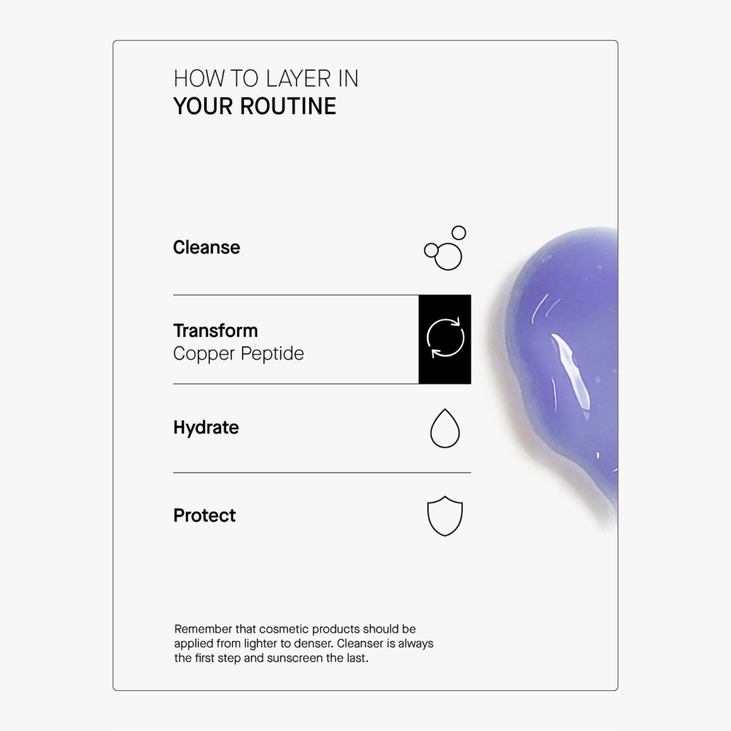3% Πεπτίδιο Χαλκού: Τα πεπτίδια χαλκού απαντωνται φυσικά στο δέρμα μας και παίζουν σημαντικό ρόλο στο πώς αυτό αλληλεπιδρά με τις πρωτεΐνες, π.χ. το κολλαγόνο το οποίο παίζει σημαντικό ρόλο στην δομή του δέρματος. Όσο το δέρμα μεγαλώνει, τα επίπεδα πεπτιδίων χαλκού μειώνονται. Η τοπική χρήση προϊόντων με πεπτίδια χαλκού βοηθάει στην διατήρηδη της καλής λειτουργίας του δέρματος καθώς προσφέρει αντιοξειδωτική δράση, ενίσχυση της παραγωγής κολλαγόνου και ελαστίνης και απομάκρυνση του κατεστραμμένου κολλαγόνου και ελαστίνης από την επιδερμίδα.