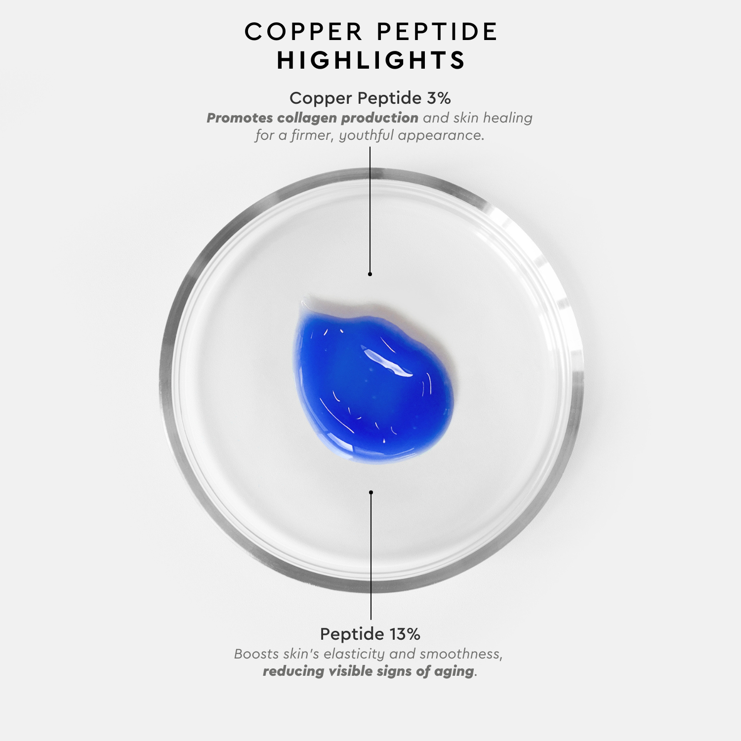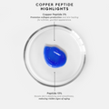 Ο ορός Copper Peptide περιέχει 3% καθαρά πεπτίδια χαλκού και ενεργοποιεί την παραγωγή κολλαγόνου και ελαστίνης, βελτιώνοντας έτσι την σφριγηλότητα και την ελαστικότητα της επιδερμίδας, και μειώνει ορατά τα σημάδια της γήρανσης. Έχει επίσης εξαιρετικές αντιοξειδωτικές ιδιότητες με αποτέλεσμα να προστατεύει το δέρμα από τις ελεύθερες ρίζες και το οξειδωτικό στρες, το οποίο προκαλεί φθορές στο κύτταρο και πρόωρη γήρανση. Τέλος, επιταχύνει τις διαδικασίες επούλωσης της επιδερμίδας και ενεργοποιεί την κυτταρική αναγέννηση, βελτιώνοντας σημαντικά την όψη των ρυτίδων και των λεπτών γραμμών και αποτρέποντας την εμφάνισή τους.