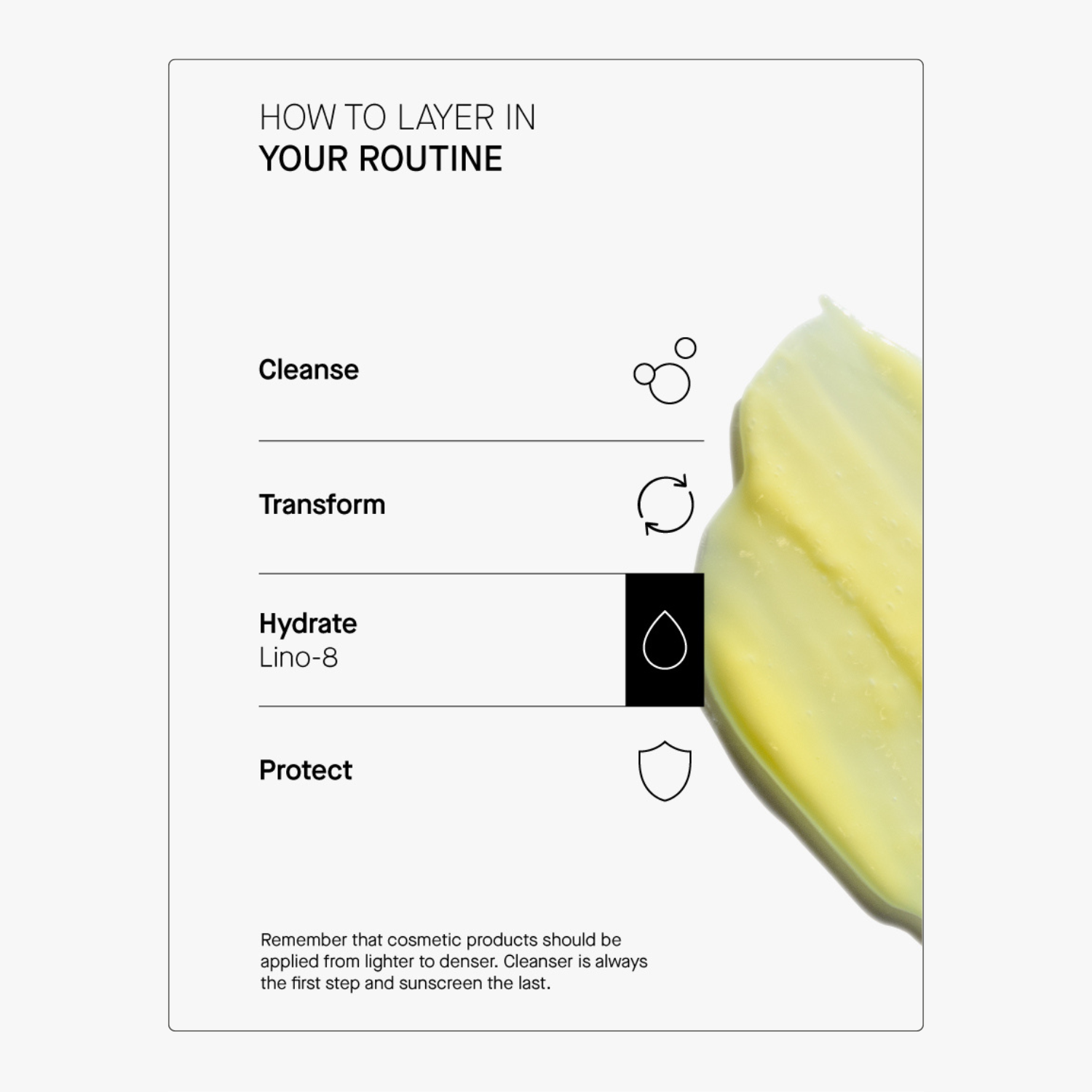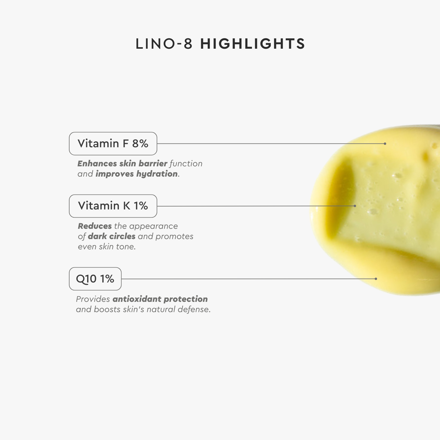 Η θεραπεία LINO-8 είναι εμπλουτισμένη με μία πανίσχυρη τριπλέτα ενεργών συστατικών που δρουν συνεργιστικά και φέρουν εξαιρετικά αποτελέσματα στην επιδερμίδα: Η βιταμίνη F είναι ένα θεμελιώδες λιπαρό οξύ με εξαιρετικές ενυδατικές ιδιότητες, που ενισχύει τον επιδερμικό φραγμό και προσφέρει ενυδάτωση που διαρκεί. Η βιταμίνη Κ είναι ένα πολύ ισχυρό δραστικό συστατικό που ενισχύει την ελαστικότητα του δέρματος, προσφέρει ομοιόμορφο χρωματικό τόνο και μειώνει τους μαύρους κύκλους γύρω από τα μάτια. Το συνένζυμο Q10 είναι ένα ισχυρό αντιοξειδωτικό που ενισχύει την παραγωγή κολλαγόνου, μειώνει την εμφάνιση των λεπτών γραμμών και των ρυτίδων και προσφέρει σφριγηλό και νεανικό δέρμα.