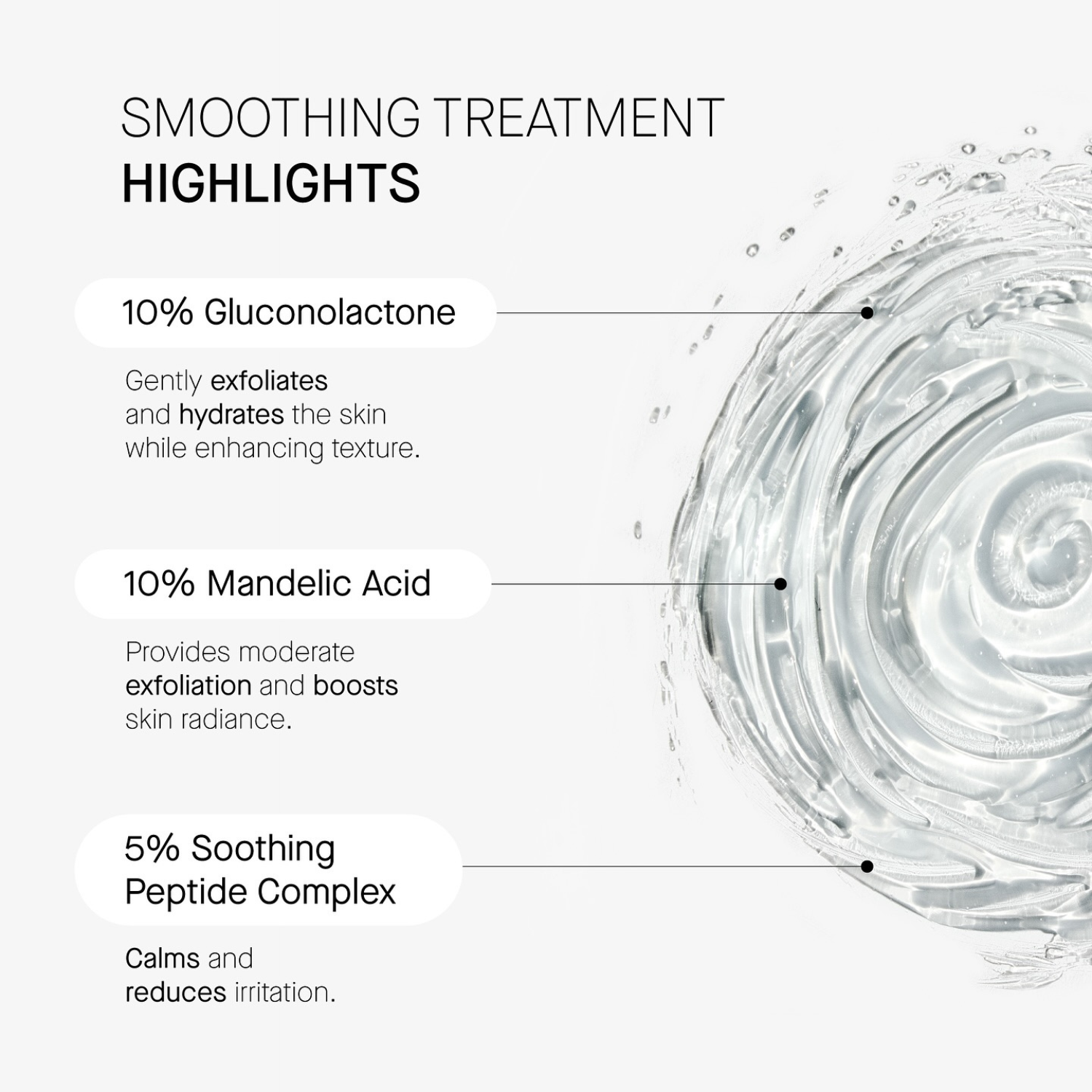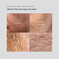 Το serum Smoothing Treatment έχει επίσης 5% περιεκτικότητα σε ένα καταπραϋντικό σύμπλεγμα πεπτιδίων που μειώνουν τους ερεθισμούς και την φλεγμονή, ηρεμώντας το δέρμα. Αυτά τα πεπτίδια λειτουργούν σε αρμονία με τα οξέα, εξασφαλίζοντας ότι το δέρμα θα ανανεωθεί, χωρίς κανένα δυσάρεστο σύμπτωμα.