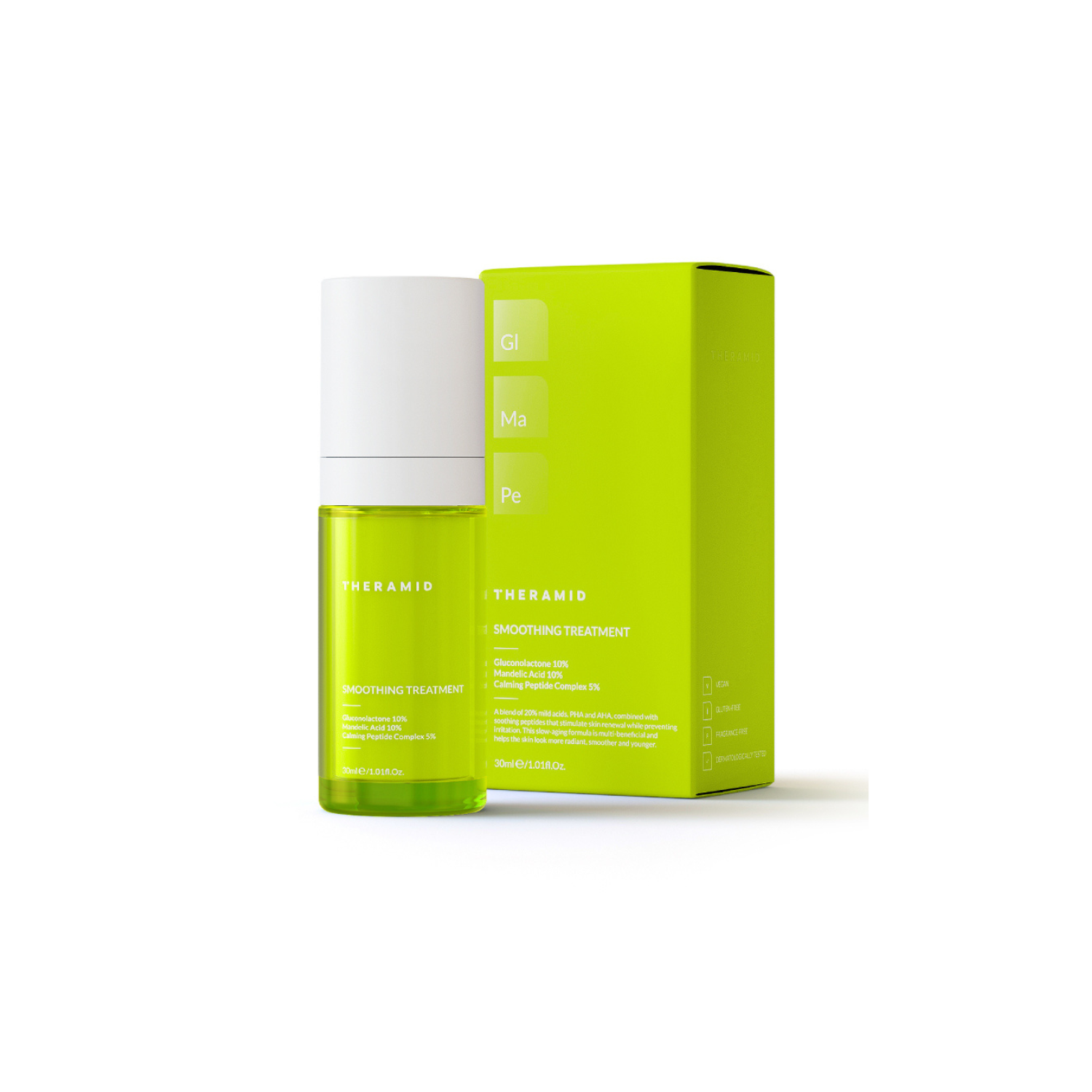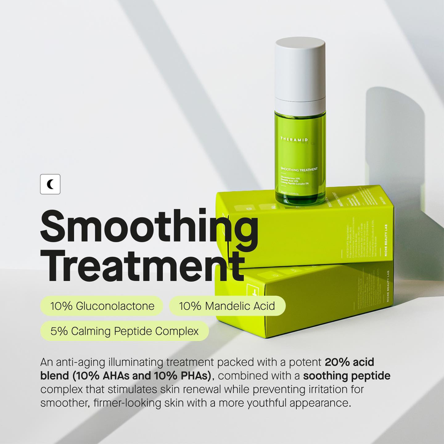 Απόκτησε δέρμα πιο απαλό από ποτέ την ώρα που κοιμάσαι! Ανακάλυψε την επαναστατική αντιγηραντική θεραπεία λάμψης Smoothing Treatment της εταιρείας THERAMID by Niche Beauty Lab, που έχει 20% περιεκτικότητα σε οξέα (10% AHAs και 10% PHAs), τα οποία συνδυάζονται με ένα καταπραϋντικό σύμπλεγμα πεπτιδίων που ενισχύει την κυτταρική ανανέωση και προλαμβάνει τους ερεθισμούς.